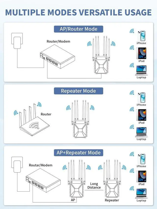 Multiple Flexible Modes: This wifi extender signal booster outdoor Support AP, router, repeater, A