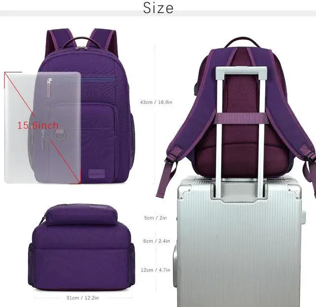 [(LARGE CAPACITY)] The classical laptop backpack employs 17"x12"x9" basic construction with 2 spacious compartments and can hold 15.6 inch laptop. One spacious packing compartment roomy for daily necessities, tech electronics accessories. Front compartment with many pockets, pen pockets and key fob hook, makes your item organized and easier to find. Two extended side pockets to better protect your water bottle or umbrella.