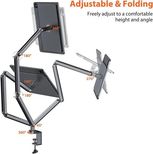 Adjust Any Angle You Want:There are 4 angle adjustment joints (1*45deg, 2*180deg, 1*270deg), 1*360deg gimbal, 1* universal rotating head to meet any angle and position you need. Max Height 23.62 inch, bend the arm and turn the holder to the most comfortable viewing position whether you are standing, sitting or lying in bed.