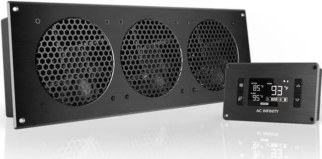 Overview The ultra-quiet fan system is designed to cool home theaters, entertainment centers, and audio video cabinets. Included fans use a custom motor engineered to minimize noise during speed variations and are certified by CE and RoHS. Contains AC Infinity axial fans ACX-FD1225 (B) 05W5 which meet UL-507 standards for safety under Underwriters Laboratories certificate E503903. Containing dual ball bearings rated at 67, 000 hours, the unit can be mounted in any direction. Features a CNC machined aluminum frame with a modern brushed black finish. Fans are set to exhaust air out the frame but this can be reversed to intake air using a screwdriver.