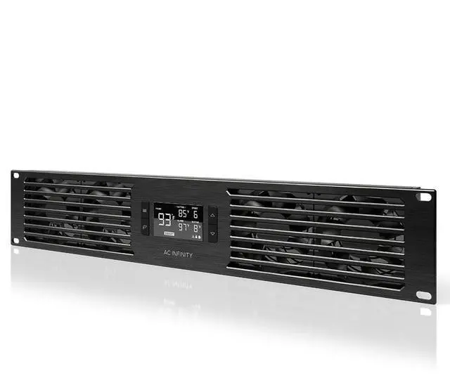 An intelligent fan system designed for cooling audio video, DJ, server, network, and IT equipment racks. Protects rack-mount equipment from overheating, performance issues, and shortened lifespans. Programmable thermostat controller with automated speed control, alarm warnings, and backup memory. Premium anodized aluminum construction with CNC-machined detailing for a professional appearance.