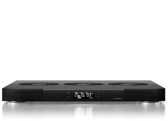 OverviewA quiet cooling fan system designed to be placed on top of AV components such as receivers, amplifiers, and DVRs. Maintaining an optimal temperature for components prevents overheating, ensures constant performance, and extends their lifespan. The LCD digital controller on the front of the system features a smart thermostat with speed control and status alerts. The steel enclosure houses three dual-ball bearing blowers that pull heat out of the component and exhaust out the top. The dual ball bearings also allow this fan system to be mounted horizontally or vertically. Its slim low-profile design enables the unit to fit in tight spaces.