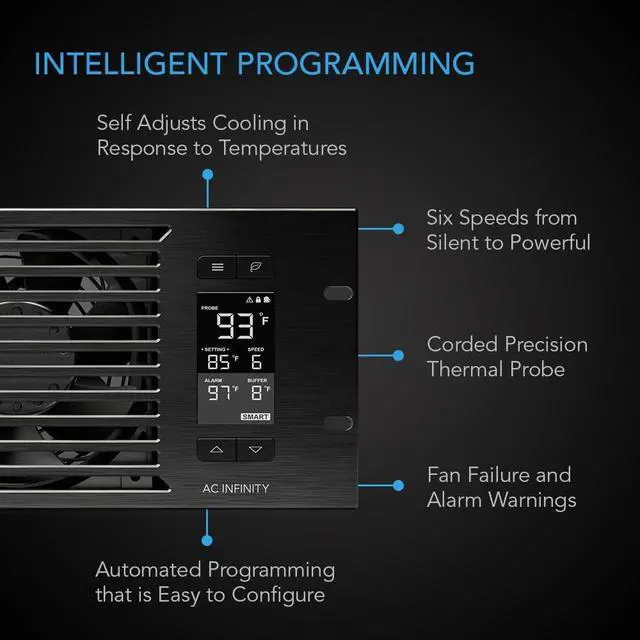 An intelligent fan system designed for cooling audio video, DJ, server, network, and IT equipment racks. Protects rack-mount equipment from overheating, performance issues, and shortened lifespans. Programmable thermostat controller with automated speed control, alarm warnings, and backup memory. Premium anodized aluminum construction with CNC-machined detailing for a professional appearance.