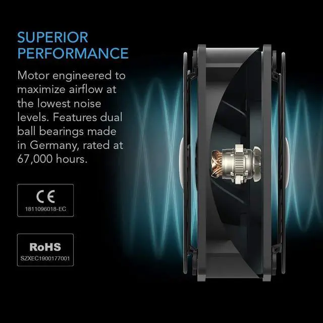 The AC Infinity axial fan is CE and RoHS certified. Heavy Duty ConstructionThe fan's housing is constructed of die-cast aluminum painted black and able to perform well in harsh environments and withstand shocks. Its impeller and blades are molded with thermoplastic which have a high resistance to flammability. Impedance protected motors contains windings that have a higher resistance to heat during a rotor lock. Containing long life dual ball bearings, the fans can be run continuously for 67, 000 hours and be mounted in any direction. ApplicationsThis high speed fan is suitable in applications where maximizing airflow is the primary objective and a louder noise level is tolerable.