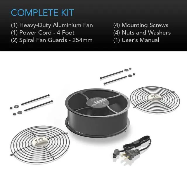 Product DescriptionThe heavy duty axial fan kit is designed for custom projects and as a replacement fan. The fan runs on 100 to 120V AC and contains everything needed to easily mount the fan and power it through a wall outlet. Includes a 4 foot power cord that can be easily attached to the fan's metal terminals and allows it to be powered through a wall outlet. The plug cord can also be cut and be converted into lead wires to be connected to a wired AC power source. Also includes two 254 millimeter metal fan guards and a mounting screw set.
