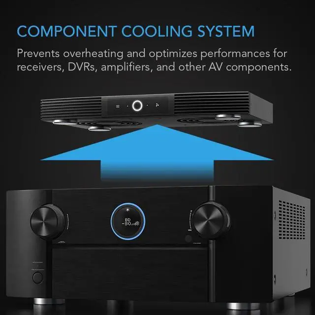 A quiet fan system designed for cooling routers, modems, game consoles, and other AV components. ^^ Protects components from overheating, performance issues, and shortened lifespans. ^^ Programming features two thermal trigger modes and four speed control options. ^^ Contains two dual-ball bearing blowers with PWM-controlled motors to minimize noise.