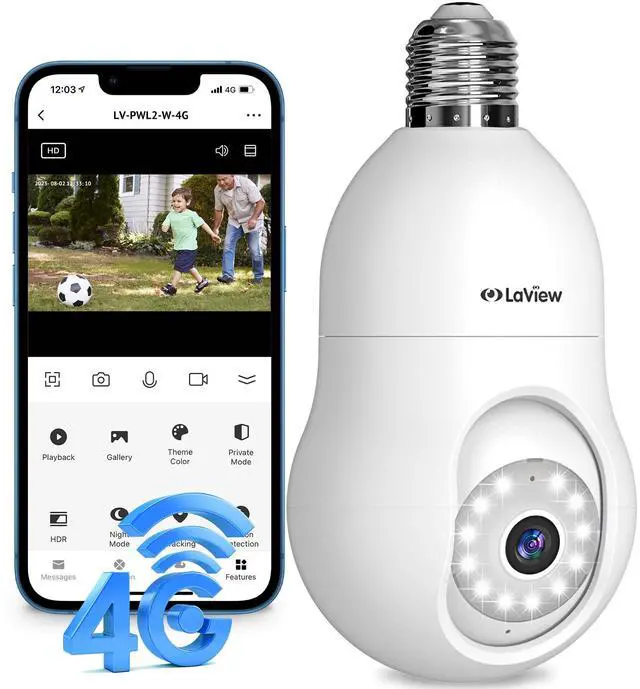 LaView 4G LTE Cellular Light Bulb Security Camera,3602K Security Cameras Wireless Outdoor Indoor 4MP Full Color Day and Night,Motion Detection, Audible Alarm,Easy Installation,Compatible with Alexa