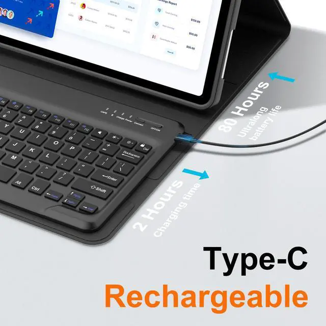 La conexion Bluetooth comoda y rapida te permite usar el teclado en cualquier lugar y en cualquier momento. Y sus teclas son silenciosas y comodas. El teclado para iPad Air de 13 pulgadas adopta la interfaz tipo C mas general, se carga durante 2-3 horas y puede funcionar de forma continua hasta 70 horas con un uso normal. El teclado de la funda para iPad Air de 13 pulgadas viene con un modo de ahorro de energia; si no se utiliza durante mucho tiempo, entrara en estado de hibernacion.