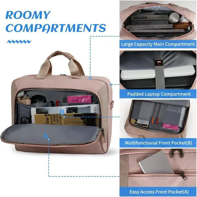 Large Capacity & Multiple Pockets: Dimension of large laptop bag: 16.5*12.6*5.1, weight: 1.65 lbs. 3 main compartments to meet all your needs well. The main tech compartment can fit 17 inch laptop (up to 17.3 inch) and 12.9 inch iPad. 1 Front large easy access pocket with 4 slots for magazines, textbooks, paper, kindle, wireless mouse, pens, passport, wallet, etc. 1 Front small pocket keep your small items like keys, change purse, tissue, etc.