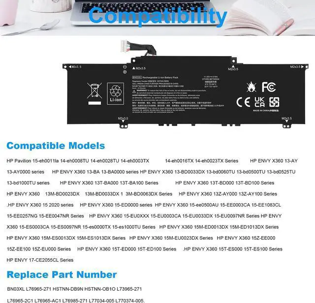 Compatible Models: for ENVY X360 13-ay0000 Series(13-ay0360ng ,13-ay0007ca ,13-ay0378ng, 13-ay0055cl, 13-ay0065AU , 13-ay0009na, 13-ay0002nd, 13-ay0010nr, 13-ay0021nf, 13-ay0003nf, 13-ay0008na, 13-ay0001nc , 13-ay0075nr,13-ay0021nr, 13-ay0004nc) and HP ENVY 13 (13-ba0004nu,13-ba0003nu); ENVY X360 13-ar0082au; Envy x360 15-ee0257ng ; Envy x360 15m-ee0013dx and more series. [Note: Please open the back cover of the laptop to confirm the original battery part No.!]
