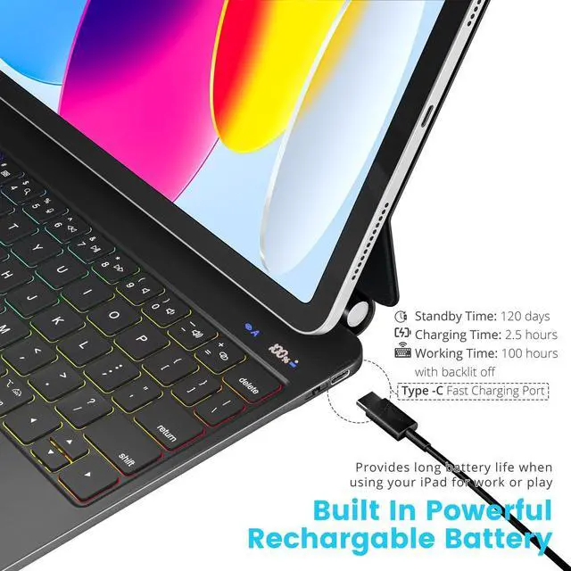 [(Long Lasting Battery)] The battery for ipad 10th generation case is ultra-efficient design let you work longer on a single charge. The keyboard charges the battery very quickly via USB-C. With LED display that shows remaining battery percentage.
