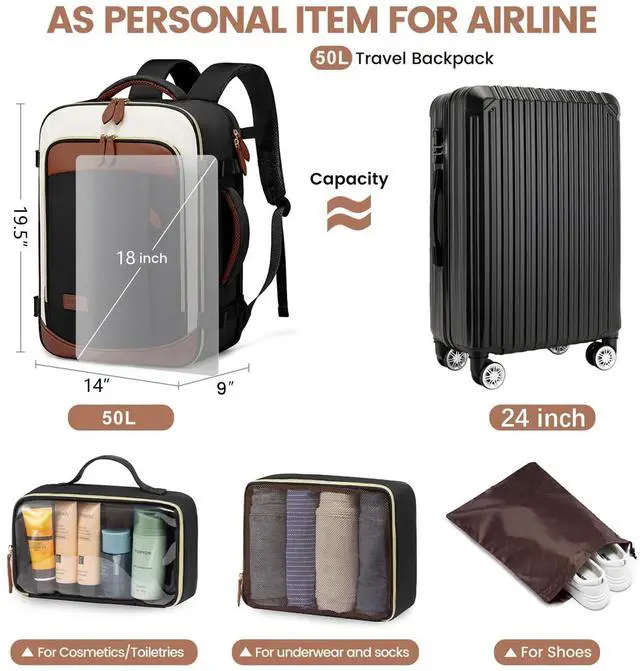 EXPANSIVE 50L CAPACITY FOR ORGANIZED TRAVEL - Journey with everything your travel essentials for 4-7days, neatly organized in this versatile carry on backpack. Its luggage-style main compartment, separate laptop section, and multi-pocket zipper front pocket offer unmatched convenience