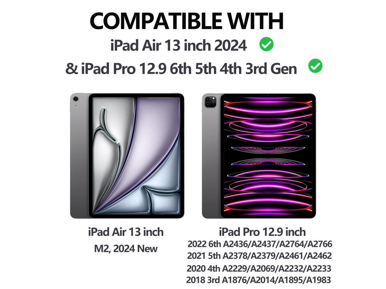 - COMPATIBILTTY - This premium detachable keyboard case is perfectly compatible with 2024 iPad Air 13-inch and 12.9-inch iPad Pro 6th Generation (A2436/A2437/2764/A2766); 2021 12.9 in Pro 5th Generation (A2378, A2379, A2461, A2462); 2020 12.9-in Pro 4th Generation (A2229, A2069, A2232, A2233); 2018 12.9'' iPad Pro 3rd Generation (A1876, A2014, A1895, A1983). NOT FIT FOR iPad 5th, 6th generation (9.7 inch).