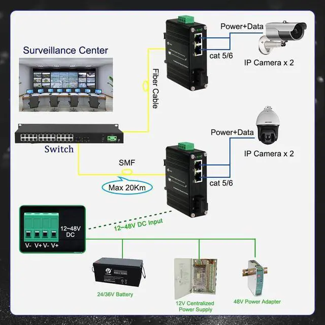 Single Mode up to 20km - SC media converter can extend the IP Ethernet signal up to 12.43 Miles (20km) over single mode dual-fiber cable. You can use it in IP surveillance system or extend Ethernet IP signal.