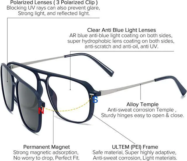[(Multifunctional Glasses Design)] The magnetic clip on sunglasses is very convenient to wear. The magnets on both sides of the clip will automatically adsorption the frame together when approaching. When you are using a computer and phone, it is anti blue light glasses. When you are outside in the sunlight, put on the polarised clip, it's sunglasses. If you are driving, put on yellow clip, it's driving glasses.