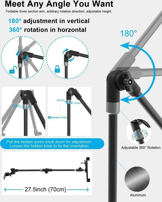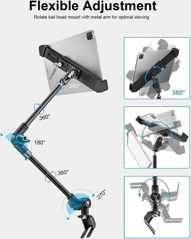 [(Support Height and All-Angle Adjustment)] The most innovative design of the woleyi tablet mount is that each bracket rod can be quick adjusted to achieve horizontal or vertical 360-degree rotation and 180-degree bending to meet any angle and position you need. Max Height 27.5 inches(700mm). The tablet stand is also equipped with a sturdy metal ball head for double adjustment, allowing you to adjust the devices to the best angle.