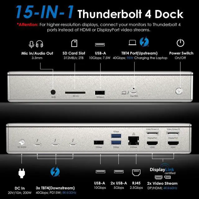 [15-in-1 Thunderbolt 4 Dock] Features a comprehensive range of ports, including 1x Upstream Thunderbolt 4 Port (40Gb/s, 98W), 1x 160W Power adapter, 3x Downstream Thunderbolt 4 Ports (40Gb/s; PD15W; 8K), 1x 2.5Gbps RJ45 Ethernet port, and 2x Video Stream (4K DP+ 4K HDMI),1x Audio, 1x SD Card Slot (312MB/s), 2x USB-A 10Gbps+2x USB-A 5Gbps. Connect all your essential peripherals with ease. NOTE: This dock is Thunderbolt 4 and Displaylink DL6950 hybrid solution,please download the latest driver from DisplayLink before using the HDMI/DP ports.