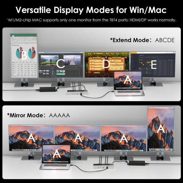[Single 8K Display & Multiple 4K Displays] This Thunderbolt 4 dock supports an impressive single 8K display or Quad 4K displays (2x HDMI/DP + 2x Thunderbolt 4), providing stunning visuals and enhancing productivity. You can effortlessly switch between extend and mirror modes to customize your workflow. *Please note: M1/M2/M3-based Macs can only have one video output from the three Thunderbolt 4 ports, but the HDMI and DP ports function n