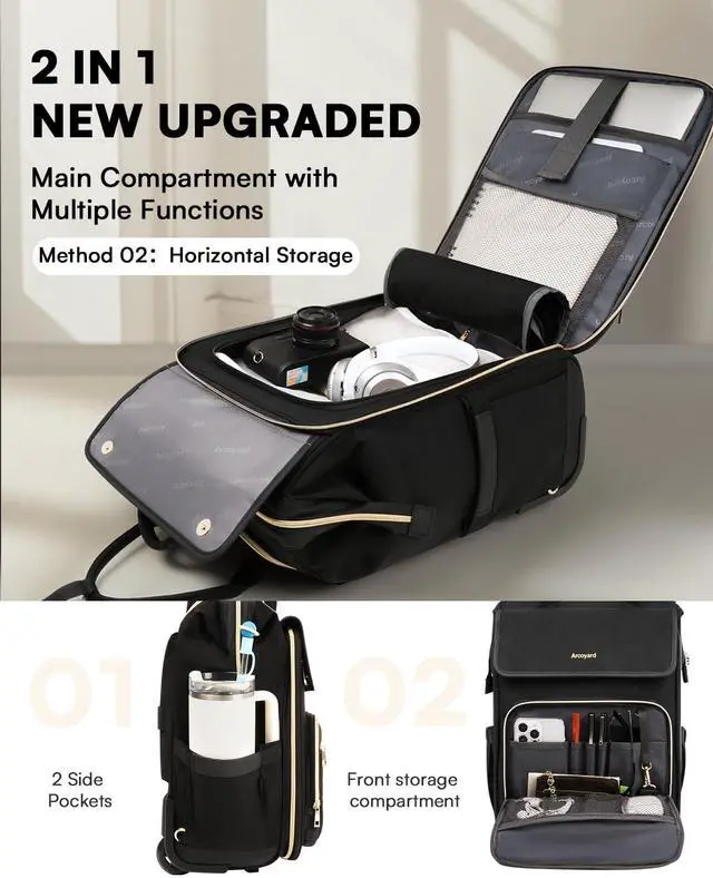 New Upgraded Design This rolling backpack integrates vertical and horizontal storage, providing flexibility for different needs. The rolling laptop bag magnetic flap keeps things stylish and organized.