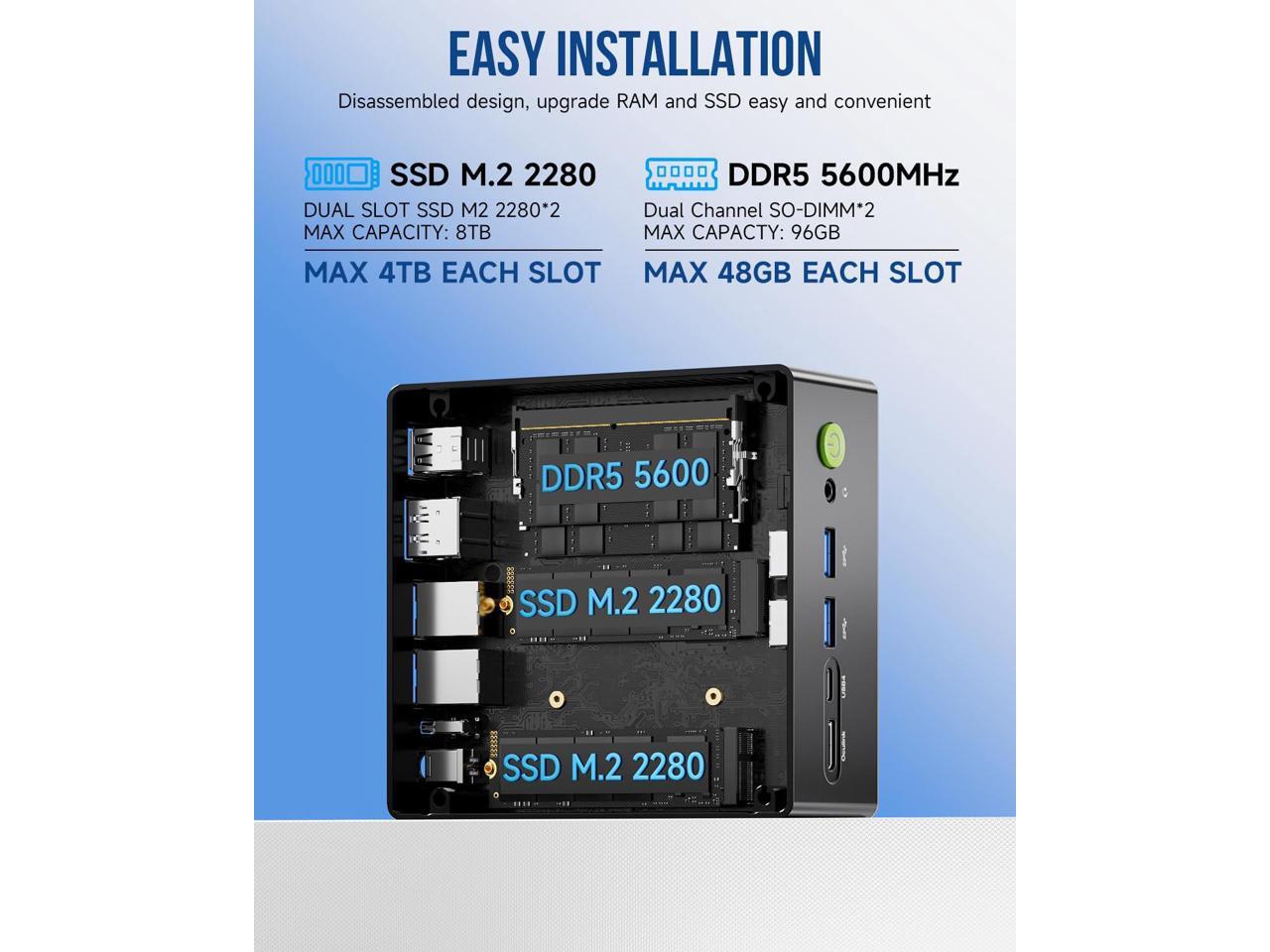 [(64GB DDR5 + 1TB SSD)] Equipped with 64GB memory capacity,DDR5 speed up to 5600MHz, offering faster data processing and multitasking. The dual 32GB channels support expansion up to 96GB, allowing users to customize based on their needs. The 1TB PCIe 4.0 M.2 SSD ensures ultra-fast storage, with expansion options up to 8TB, making it perfect for heavy workloads and large storage needs