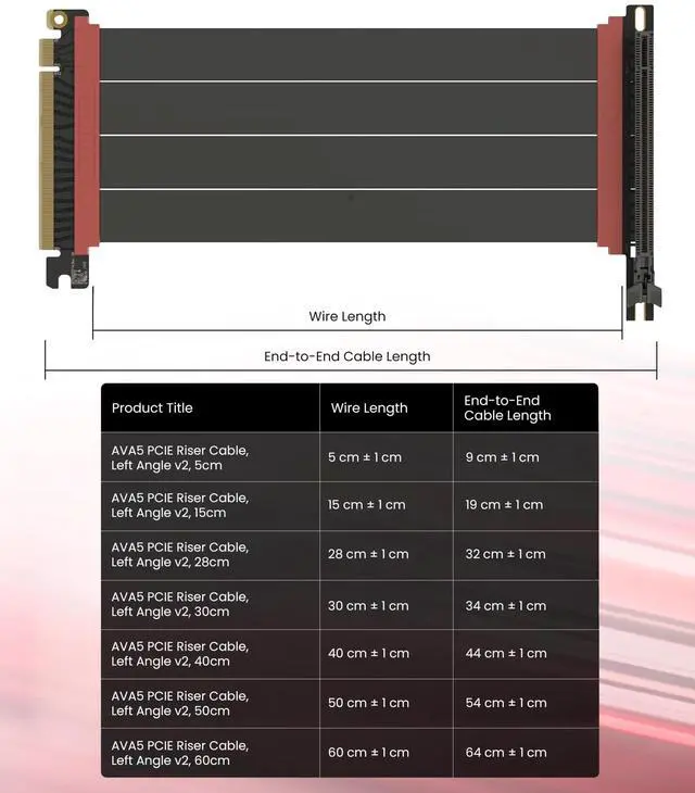 ^^ Choose the right Cable Choose a length between 235.4 inches (see Installation Instruction) and the connector you need: right angle, straight, left angle, double reverse, single reverse right, single reverse left, or single reverse straight. One family covers ITX sandwiches, server trays, and vertical displays. Consistent Gen5 signal integrity across sizes makes it a flexible PCIe extender or GPU riser cable for clean cable management today with room to evolve tomorrow. ^^ Customer Support & Direct-Exchange Warranty We offer online and email customer supportevery inquiry answered within 24 hours. Enjoy a hassle-free direct exchange warranty and prompt resolution of concerns; Business customers can access Business Pricing. If anything isnt right, reach out and well resolve it fastservice that matches top-tier PCIe 5.0 performance.