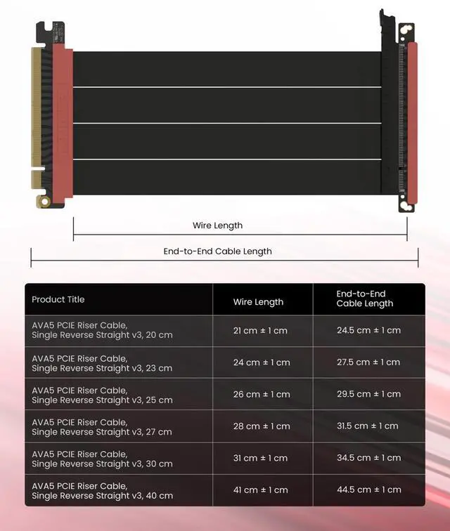 ^^ Choose the right Cable Choose a length between 235.4 inches (see Installation Instruction) and the connector you need: right angle, straight, left angle, double reverse, single reverse right, single reverse left, or single reverse straight. One family covers ITX sandwiches, server trays, and vertical displays. Consistent Gen5 signal integrity across sizes makes it a flexible PCIe extender or GPU riser cable for clean cable management today with room to evolve tomorrow. ^^ Customer Support & Direct-Exchange Warranty We offer online and email customer supportevery inquiry answered within 24 hours. Enjoy a hassle-free direct exchange warranty and prompt resolution of concerns; Business customers can access Business Pricing. If anything isnt right, reach out and well resolve it fastservice that matches top-tier PCIe 5.0 performance.
