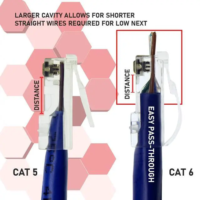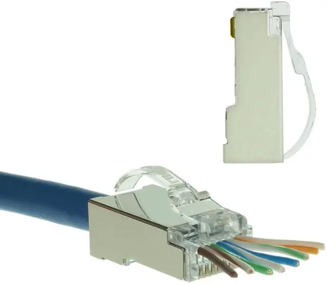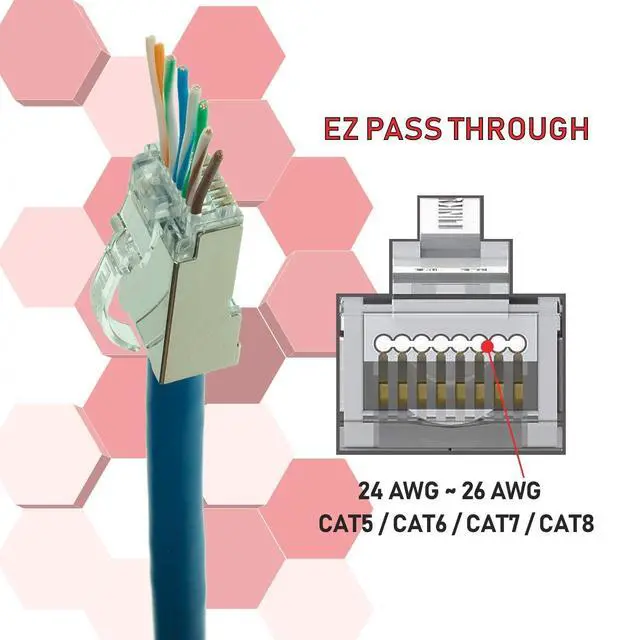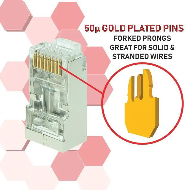 Get WiredLINKUP Cat6 RJ45 Snagless Shielded Twisted Pair Easy Pass Thru Modular Connectors maintain gigabitEthernet performance standards. Featuring affordable pricing and a quality build that meet allcertification standards. These RJ45 Snagless plugs are easily installed: simply strip the jacket, feed the wires through theconnectors and crimp with the corresponding crimping tool. No need to straighten thecable which can cause signal loss due to cable damage. The transparent casingallows you to easily verify the routing sequence and prevent wasted connectors due toinstallation mistakes. Compatible with all Category 6 8p8c wires between 24 to 26 AWG. Standard 3 prong passthrough design allows for the length of your RJ45 cables to be easily customizable. Also backwards compatible with Cat5e and Cat5 cables. Featuring gold-plated contact points for reliable fast connections to build your network, with a 3prong design for enhanced signal integrity. These Cat6 Snagless Easy Pass Thru Connectors are tested and are RoHS, UL, Reach and FCCstandards compliant, and ISO 9001, ISO 14001 Certified. Compliant with applicationstandard PoE+ (Power over Ethernet Plus). Backed by a Linkup Limited 1-Year Warranty.