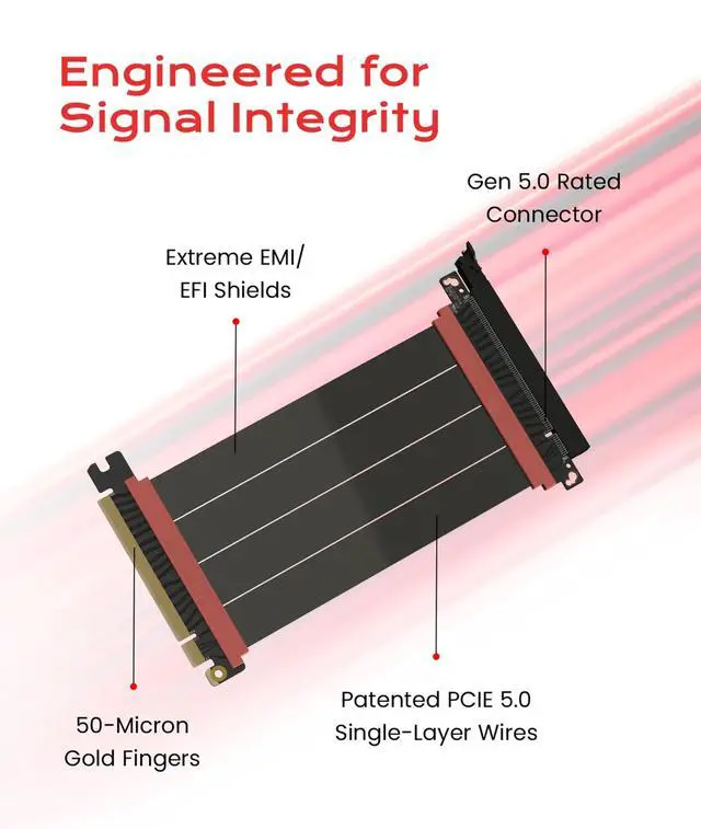 Verified Compatibility Built for vertical GPU mount and standard layouts across towers, SFF/ITX sandwich cases, open benches, and water-cooled rigs. Fully backward-compatible with PCIe 4.0 and validated on ASUS WS WRX80SE WiFi II and WRX90E Gen5 boards. Ready for next-gen cards like RTX 5090 and RX 9070. Use this PCIe 5.0 riser cable to place the GPU exactly where airflow and aesthetics demandwithout giving up stability. ^^ Gen5 x16 Performance & Shielding Delivers full 128GB/s on PCIe 5.0 x16 with tuned impedance, premium conductors, and multilayer shielding to suppress crosstalk and EMI.
