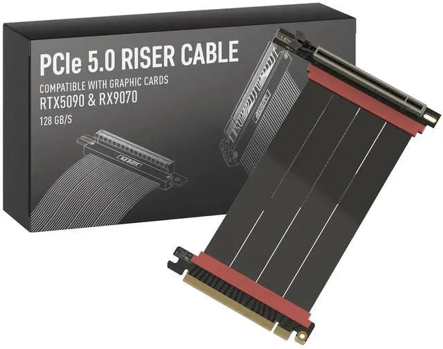 Verified Compatibility Built for vertical GPU mount and standard layouts across towers, SFF/ITX sandwich cases, open benches, and water-cooled rigs. Fully backward-compatible with PCIe 4.0 and validated on ASUS WS WRX80SE WiFi II and WRX90E Gen5 boards. Ready for next-gen cards like RTX 5090 and RX 9070. Use this PCIe 5.0 riser cable to place the GPU exactly where airflow and aesthetics demandwithout giving up stability. ^^ Gen5 x16 Performance & Shielding Delivers full 128GB/s on PCIe 5.0 x16 with tuned impedance, premium conductors, and multilayer shielding to suppress crosstalk and EMI.