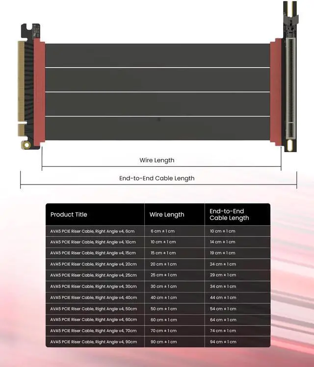 ^^ Choose the right Cable Choose a length between 235.4 inches (see Installation Instruction) and the connector you need: right angle, straight, left angle, double reverse, single reverse right, single reverse left, or single reverse straight. One family covers ITX sandwiches, server trays, and vertical displays. Consistent Gen5 signal integrity across sizes makes it a flexible PCIe extender or GPU riser cable for clean cable management today with room to evolve tomorrow.