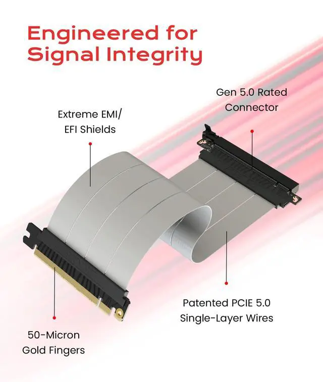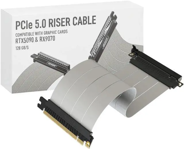 Verified Compatibility Built for vertical GPU mount and standard layouts across towers, SFF/ITX sandwich cases, open benches, and water-cooled rigs. Fully backward-compatible with PCIe 4.0 and validated on ASUS WS WRX80SE WiFi II and WRX90E Gen5 boards. Ready for next-gen cards like RTX 5090 and RX 9070. Use this PCIe 5.0 riser cable to place the GPU exactly where airflow and aesthetics demandwithout giving up stability. ^^ Gen5 x16 Performance & Shielding Delivers full 128GB/s on PCIe 5.0 x16 with tuned impedance, premium conductors, and multilayer shielding to suppress crosstalk and EMI.