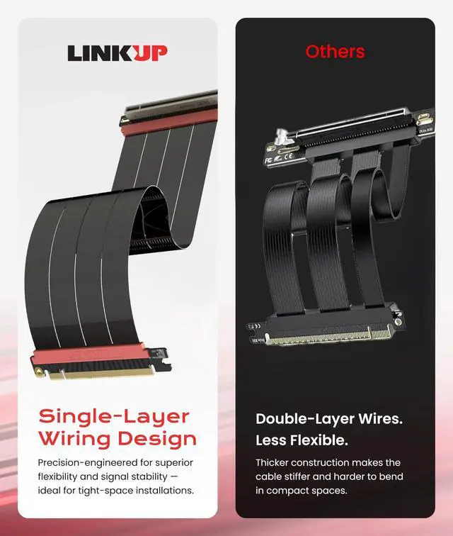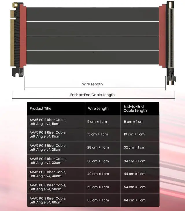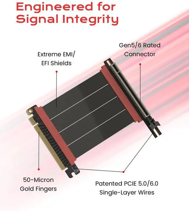 Gen5 x16 Performance & Shielding Delivers full 128GB/s on PCIe 5.0 x16 with tuned impedance, premium conductors, and multilayer shielding to suppress crosstalk and EMI. The AVA design targets clean eye margins under load and tight bends, making it a dependable PCIe Gen5 riser cable for high-FPS gaming, AI, and storage workflows. Replace Gen 3 and Gen 4 PCIe cables while preserving upgrade headroom for future GPUs.