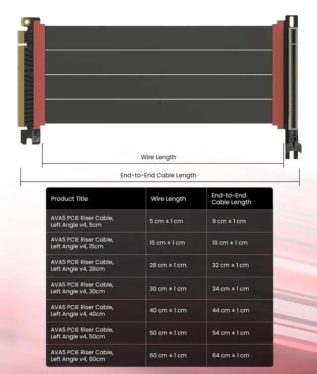 ^^ Choose the right Cable Choose a length between 235.4 inches (see Installation Instruction) and the connector you need: right angle, straight, left angle, double reverse, single reverse right, single reverse left, or single reverse straight. One family covers ITX sandwiches, server trays, and vertical displays. Consistent Gen5 signal integrity across sizes makes it a flexible PCIe extender or GPU riser cable for clean cable management today with room to evolve tomorrow.