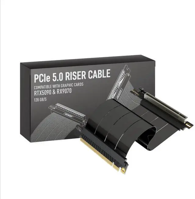 Verified Compatibility Built for vertical GPU mount and standard layouts across towers, SFF/ITX sandwich cases, open benches, and water-cooled rigs. Fully backward-compatible with PCIe 4.0 and validated on ASUS WS WRX80SE WiFi II and WRX90E Gen5 boards. Ready for next-gen cards like RTX 5090 and RX 9070. Use this PCIe 5.0 riser cable to place the GPU exactly where airflow and aesthetics demandwithout giving up stability. ^^ Gen5 x16 Performance & Shielding Delivers full 128GB/s on PCIe 5.0 x16 with tuned impedance, premium conductors, and multilayer shielding to suppress crosstalk and EMI.