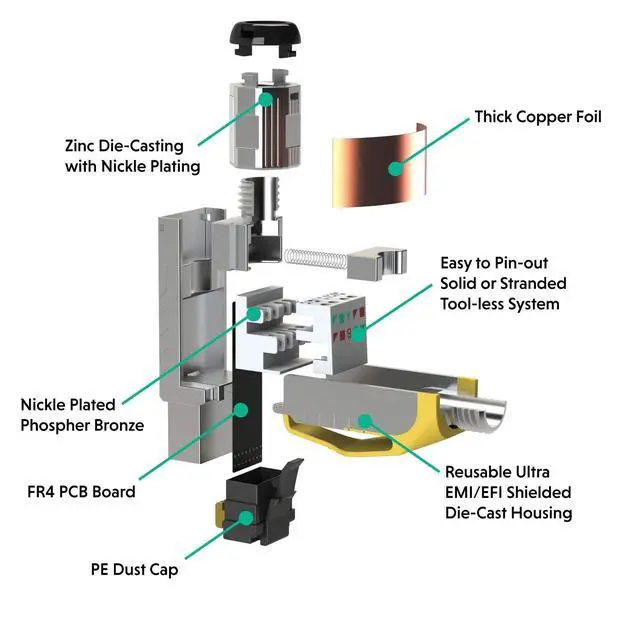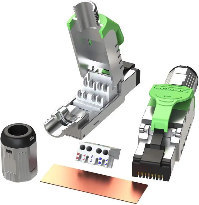 True Cat6A PerformanceLINKUP Cat6A 24K Gold Plated RJ45 Full Spec Connector supports 10G speeds at 500Mhz; perfect for ultra-high-speed applications such as HDBase-T graphics. Backwards compatible from 10GBase-T, 10 gigabit Ethernet. ^^ Easy to UseOpen hinged impact tool-free design for easy assembly. ^^ Quality BuildRobust zinc alloy housing integrates silencing cylinder to suppress EMI, NEXT, AXT interference. Screw-on metal strain relief boot increases shielding & integrity. ^^ Highly CompatibleSupports 23 to 26 AWG shielded wire with outside diameters between 6.0 mm and 7.5 mm. PoE PLUS COMPLIANT for IEEE 802.3 at Power over Ethernet (PoE+) applications.