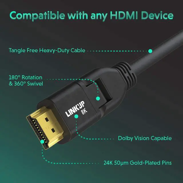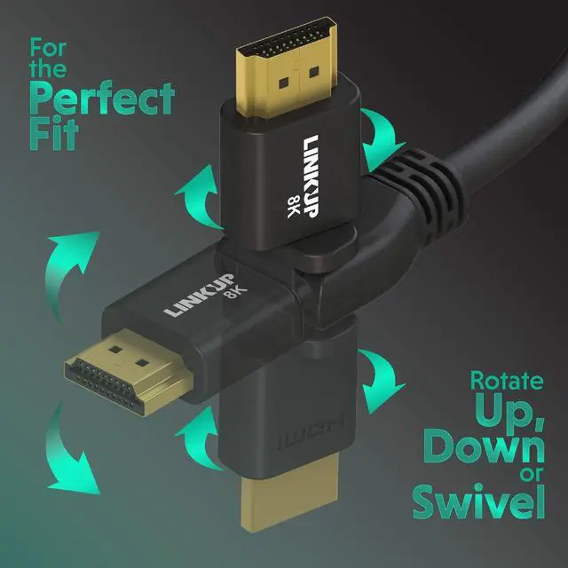 DTS: X. Comes fully equipped with Ethernet network cable support, Standard High Definition Copy Protocol 2.2 (HDCP) compliant and Certified HDMI 2.1. (Backward compatible with all previous HDMI interface versions) ^^ Superb ConstructionFeaturing 24K 50m gold-plated connectors and extreme mylar-foil and mesh tri-shielding provide pure EMI/EFI (interference) free signals. Robust molded housing, premium strain relief and 360 swivel design prevents fraying for a high-quality component that will last. Highly flexible PVC jacket, and 99.99 % high-purity OFC (oxygen-free copper wiring) means you can route and bend with confidence. ^^ Conveniently ManeuverableWith the proprietary LINKUP 360 swivel design these cables can be plugged into any device at a 90 angle and rotates 360 degrees up or down, installation in tight spaces are not an issue. Covered by LINKUP LIMITED 1-YEAR WARRANTY and premium online support.
