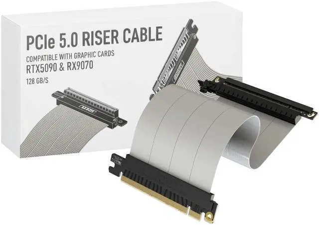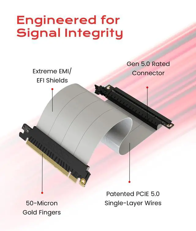 Verified Compatibility Built for vertical GPU mount and standard layouts across towers, SFF/ITX sandwich cases, open benches, and water-cooled rigs. Fully backward-compatible with PCIe 4.0 and validated on ASUS WS WRX80SE WiFi II and WRX90E Gen5 boards. Ready for next-gen cards like RTX 5090 and RX 9070. Use this PCIe 5.0 riser cable to place the GPU exactly where airflow and aesthetics demandwithout giving up stability. ^^ Gen5 x16 Performance & Shielding Delivers full 128GB/s on PCIe 5.0 x16 with tuned impedance, premium conductors, and multilayer shielding to suppress crosstalk and EMI.
