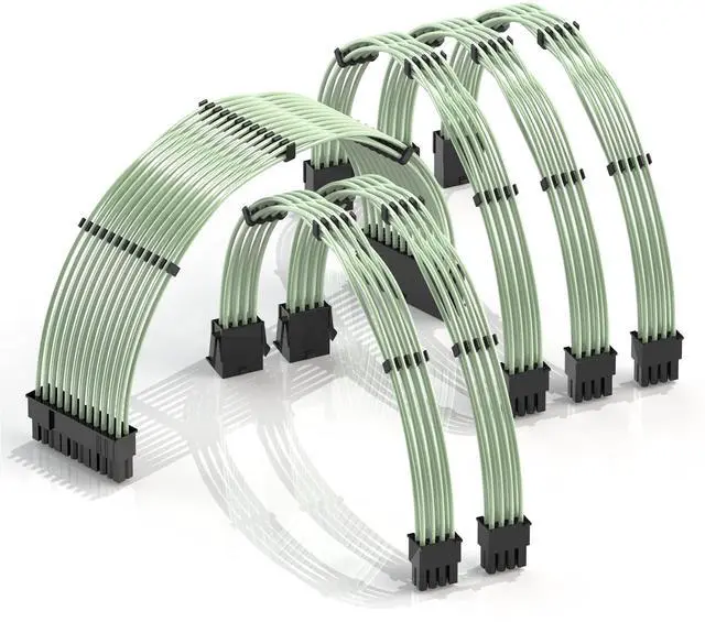 Get WiredHigh-quality high-power handling silver coated 18AWG UL1015 copper wire PSU cable extensions for refined professional builds (Cable is stiff due to Teflon coating) ^^ 2 x CPU & 3 x GPU2 x 4+4-Pin CPU power cables and 3 x 6+2-Pin GPU power cables bundled in one package. Suitable for new CPU & GPU. Also includes 24-Pin motherboard power cable ^^ VividMod your build with a Teflon coated green color in 30cm. Cable overall OD is thinner than traditional sleeved cables, but with highest temperature (200 Degree Celsius) and power-handling (1200W) of all PSU cables ^^ Robust and AdaptableAll cables are manufactured with thick 18AWG UL 1015 Tinned Copper wires and come in a high-density flexible protective sleeve allowing for an adaptable temperament.