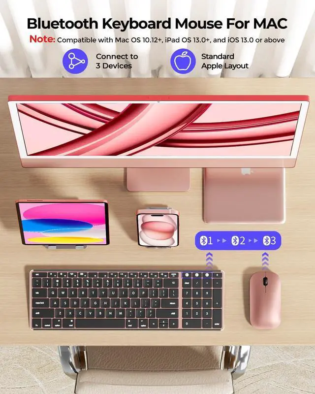Perfect for Apple Users: The Bluetooth keyboard and mouse is designed for Mac users with a standard apple layout. With advanced BT1/BT2/BT3 modes, this combo allows you to easily type across three devices, perfect for your iMac, MacBook Pro/Air, iPad