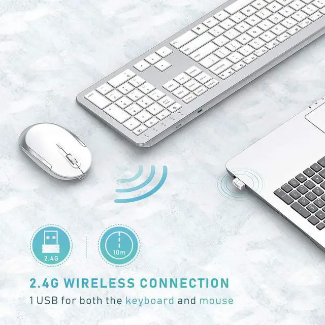 1 USB Plug for Both Keyboard and Mouse -- This keyboard & mouse combo using only 1 USB plug, which is inserted on the back of the Mouse. Stable 2.4GHz wireless provides a powerful, reliable connection up to 33ft without any lags