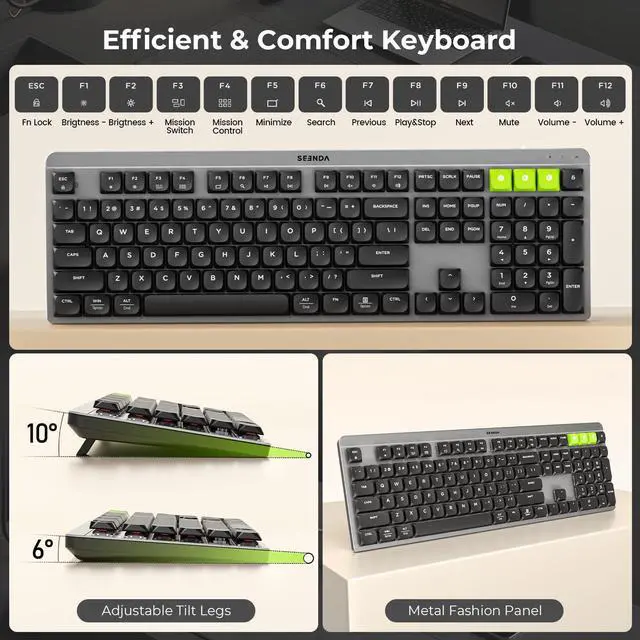seenda Bluetooth Mechanical Keyboard and Mouse, CUQ01 USB+Dual BT, Low-Profile Quiet Keys, Rechargeable, Full-Size Wireless Keyboard Mouse Compatible for Windows/Laptop/PC/MacBook/Mac, Black Gray