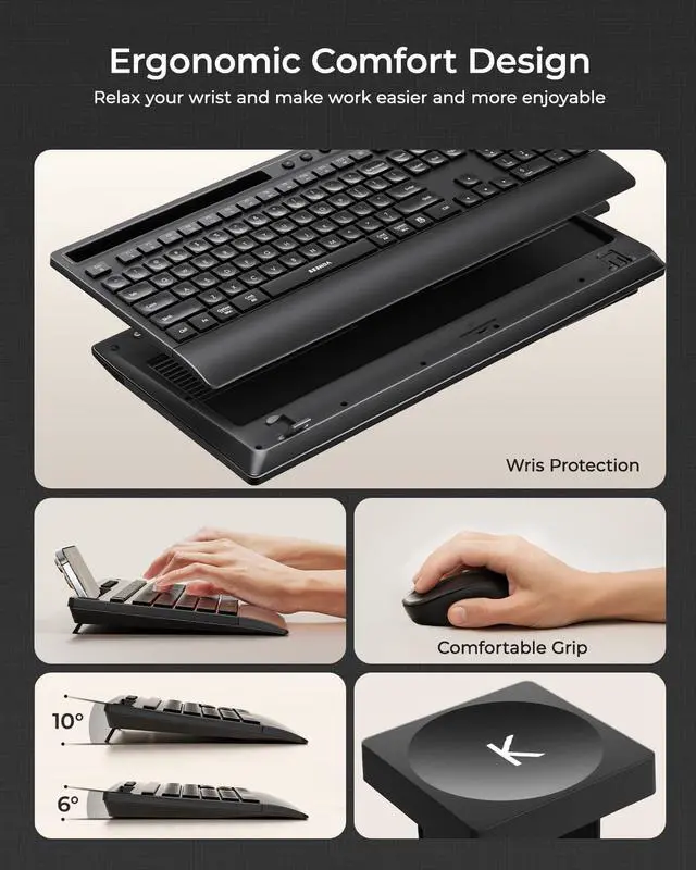 Ergonomic Comfort Design: Adjustable kickstands for personalized comfort, wrist rest for ergonomic support during long typing sessions. The comfortable grip of the mouse also helps reduce fatigue and enhance the experience