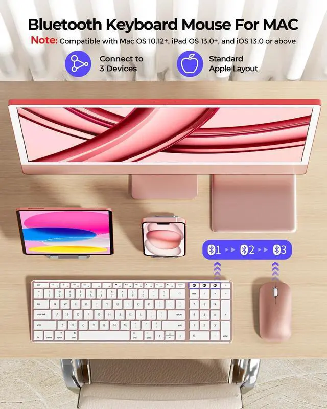 Perfect for Apple Users: The Bluetooth keyboard and mouse is designed for Mac users with a standard apple layout. With advanced BT1/BT2/BT3 modes, this combo allows you to easily type across three devices, perfect for your Mac, MacBook Pro/Air, iPad
