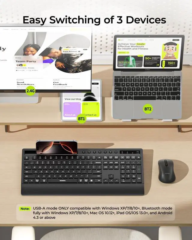 Multi-Device Connectivity: Easily switch up to 3 devices using USB-A/BT1/BT2 options. Save space and money with this versatile wireless Bluetooth keyboard and mouse set. Use USB-A for Windows devices, and connect via Bluetooth for MacBooks or iMacs ^^