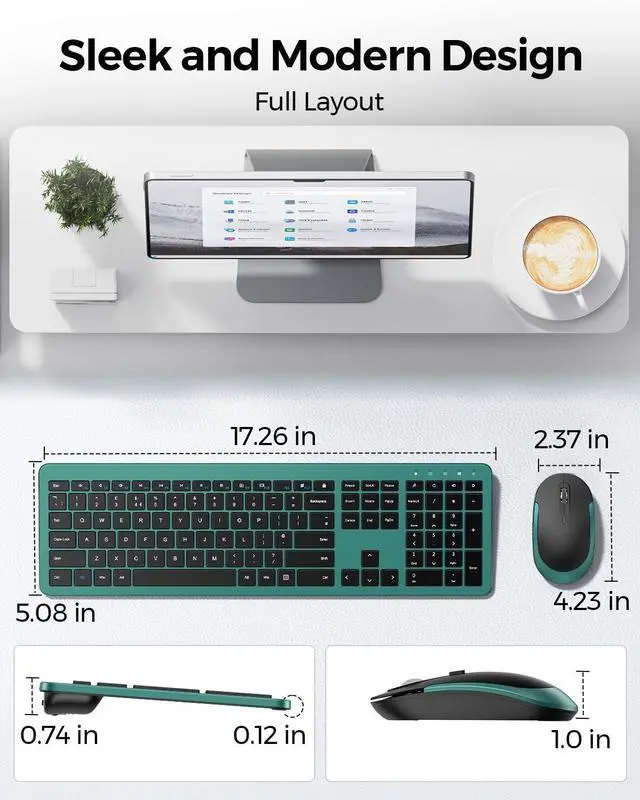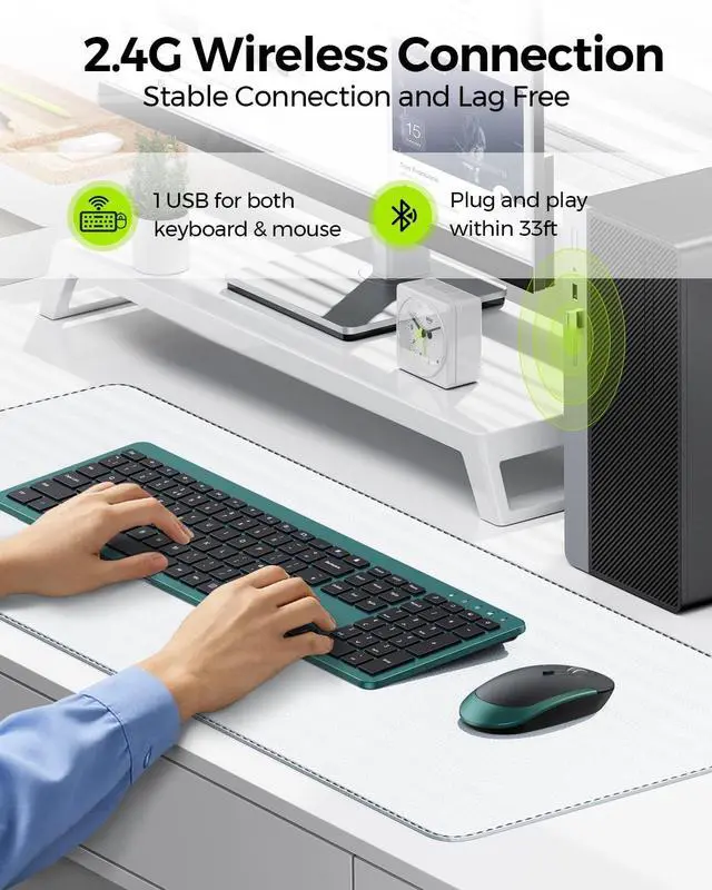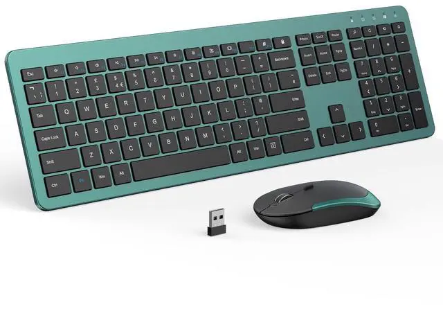 Full Size Wireless Keyboard Mouse -- Full-size keyboard provides everything you need at your fingers: the media/fn keys, numeric pad etc. The mouse and the keyboard are easily operated with sensitive touch and combined signal, so all you have to do before enjoy this amazing keyboard and mouse is plug the USB receiver from the keyboard and turn both on ^^ Sleek and Quiet Keyboard Mouse Set -- You will get a sleek & stylish keyboard and mouse set at a very reasonable price, which is matt finished with black and silver 2 colors. We wont call it "whisper quiet", but it's definitely much quieter than an traditional keyboard & mouse, especially the old-fashioned mechanical keyboard ^^ Stable Connection & Adjustable DPI -- Both keyboard and mouse are connected with the same USB receiver, thanks to the 2.4G good connectivity, you will not experience any connection or lag issues! The DPI switch on the top of the mouse makes it easy to change mouse sensitivity when gaming or whatever (DPI rage: 800-1200-1600) ^^ Intelligent Sleep for Saving Power -- Featuring withintelligent sleep mode, the build-in chips will detect your working conditions automatically, if there is no operation more than 10 minutes, the keyboard and mouse will turn to sleep mode for energy saving, you are able to wake the keyboard and mouse up in 3 seconds by pressing any key on the keyboard and the left or right button on the mouse ^^ 1 USB Receiver for Both Keyboard and Mouse -- This keyboard & mouse combo using only 1 USB Receiver, which is inserted on the back of the Mouse. Stable 2.4GH z wireless provides a powerful, reliable connection up to 33ft without any lags