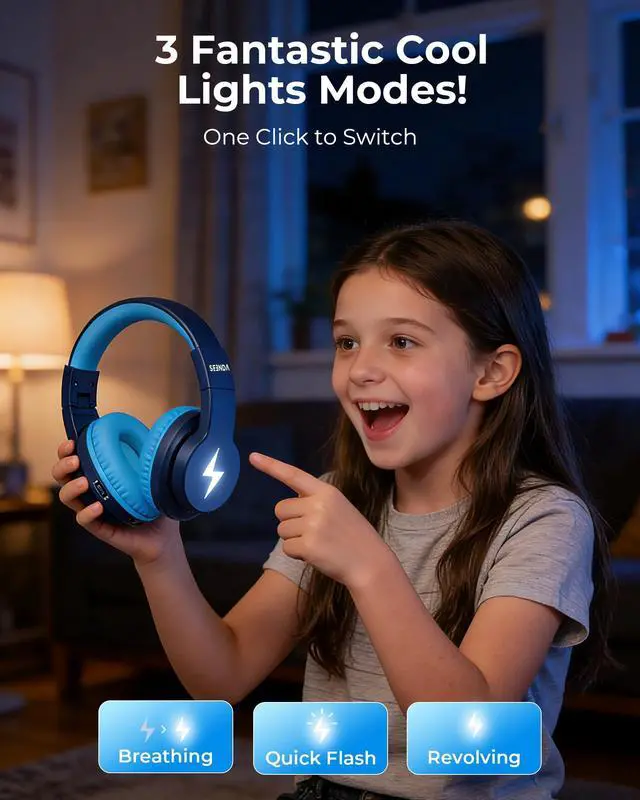 Professional Sound Quality + Dual Volume Protection -- Equipped with Seendas audio refinement tech, it supports dual safe volume limits (85/94dB) and a 40mm large driver unit. Unlike ordinary kids headphones, its volume is strictly within international hearing safety thresholds. The 40mm driver delivers richer audio details for clearer, more transparent sound. Ideal for long story-listening or online classes, it helps kids focus better and avoid high-volume hearing damage, giving parents total peace of mind. ^^ 3 Cool Light Modes for Trendy Appeal -- Built with Seendas exclusive lighting tech, it supports one-touch switching between 3 cool light modes with soft brightness.