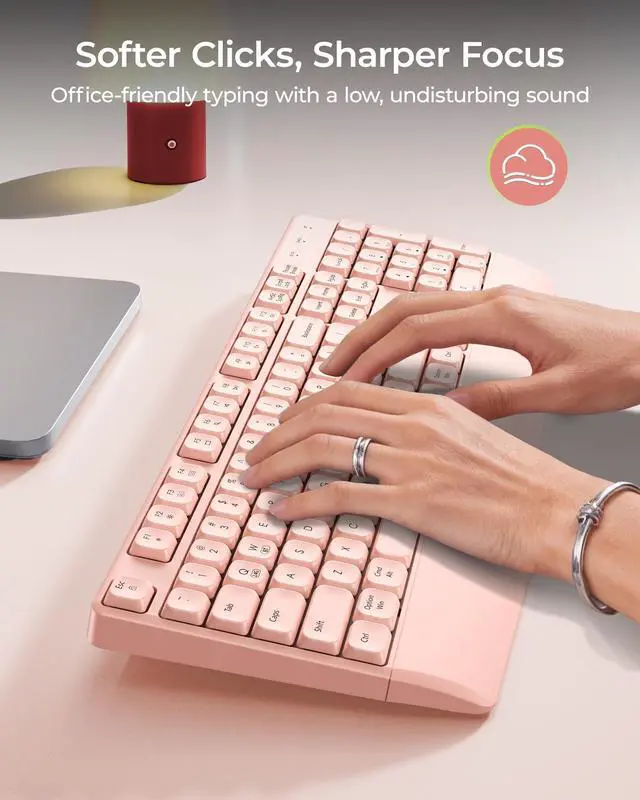 Seamless Dual-Device Connectivity: This pink bluetooth keyboard features both USB-A receiver and Bluetooth connectivity. Effortlessly switch between two devices, such as your work PC and personal tablet. The USB-A offers a stable, lag-free connection within 10 meters, perfect for a tidy, multi-device workspace. Ideal for users who manage both a Windows desktop and a MacBook or smartphone ^^ Built-in Wrist Rest for