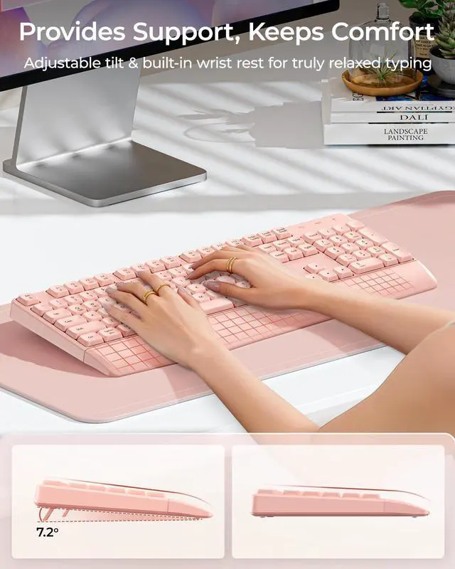 Added Comfort: Designed for enhanced comfort, this pink wireless ergonomic keyboard comes with a built-in wrist rest. It provides welcome support to help reduce fatigue during extended typing sessions, making it a more comfortable and stylish pink keyboard choice compared to standard keyboards without a rest. A practical and cute keyboard feature for long hours of office work or relaxed home computing ^^ Long-Lasting Power with a