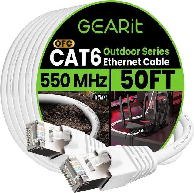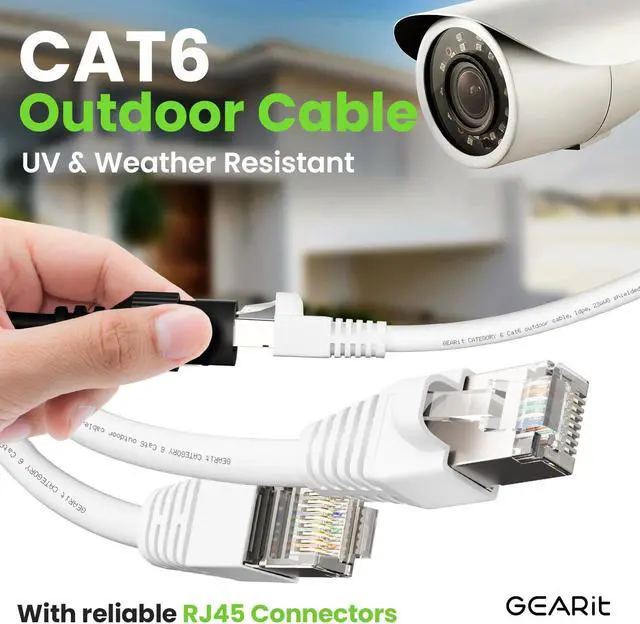 GEARit Cat6 Ethernet Cable for outdoors is a FTP -Foiled Twisted Pair network cable, perfect for direct burial, and it's UV/water resistant. Cat 6 Internet Cable protects your Internet signal from interference. It is rugged and flexible, so there is no need to pipping. This high speed cable reaches up to 10 Gbps and has a bandwidth of 550 MHz. You can connect the patch cable to any network device in your home or business. It also works with video game consoles such as PS4/PS5/Xbox One/Xbox 360. iled Twisted Pair network cable, perfect for direct burial, and it's UV/water resistant.