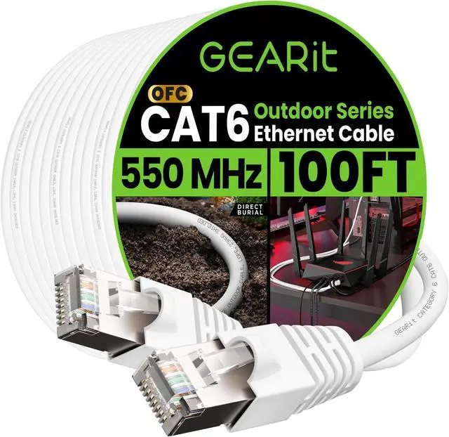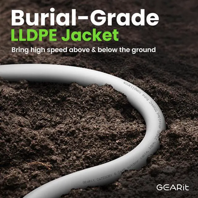 • GEARit Outdoor Ethernet Cable - This direct burial Cat6 cable combines ruggedness, blazing speed and impressive value to create the perfect Ethernet networking solution for your outdoor router, backyard office, permanent or temporary outdoor installation, or anywhere you need a reliable network connection that can stand up to weather and harsh conditions.